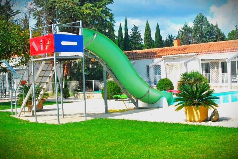A l'extérieur un jardin de plus de 3000m2 avec une piscine avec toboggan aquatique, un barbecue, un boulodrome, une aire de jeux, un filet de volet, une table de ping-pong.